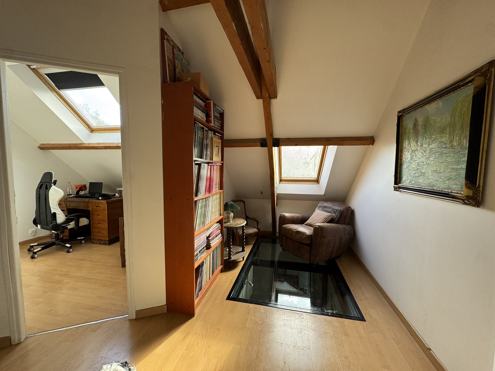 Au deuxième étage : un espace lecture, deux belles chambres dont une avec salle d’eau et wc, ainsi qu’un espace grenier aménageable. Le volume total pourrait devenir un vaste espace parental.